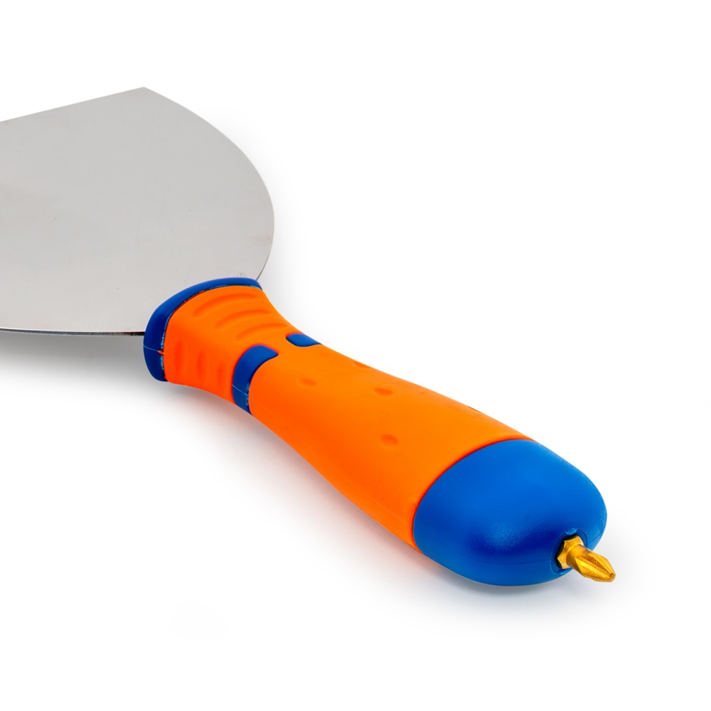 Das konisch geschliffene Spachtelblatt aus rostfreiem Edelstahl sorgt für gleichmäßige Spachtelergebnisse und eine hohe Lebensdauer. Der ergonomisch geformte 2K-Griff liegt angenehm und rutschfest in der Hand, wodurch selbst längere Arbeitseinsätze komfortabel und kontrolliert bleiben.