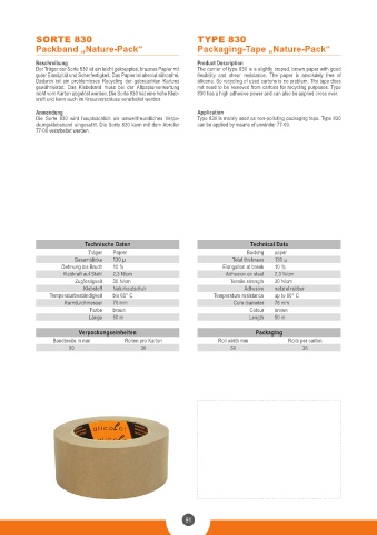 Die Sorte 830 wird hauptsächlich als umweltfreundliches Verpa- Type 830 is mainly used as non-polluting packaging tape. Type 830